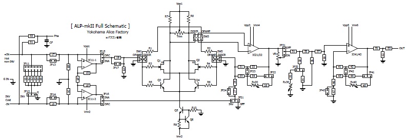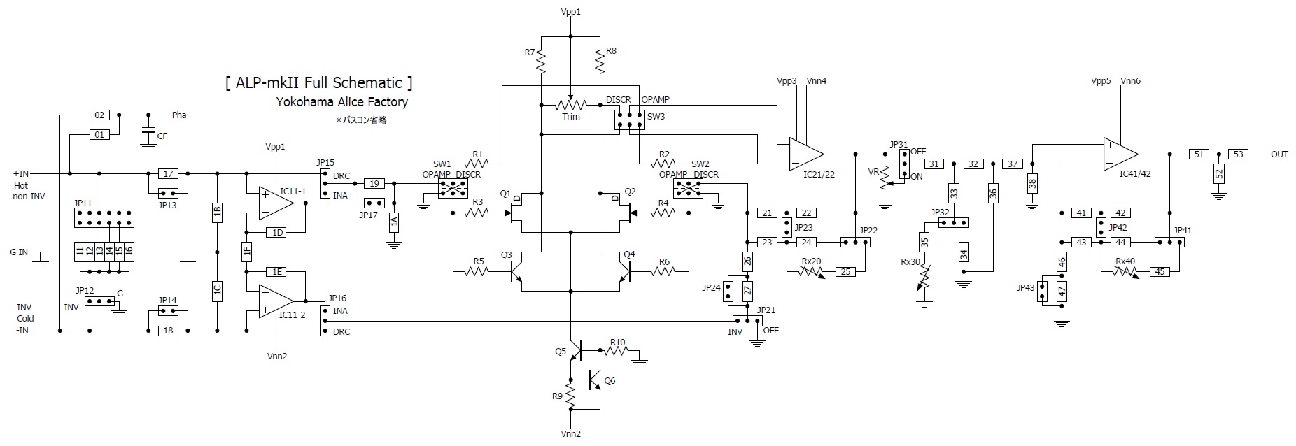 【 全体回路 】 アリス 「ALP−mkIIの全回路図です。電源回路は別ページに掲載します。」 ※クリックすると大きな図面が開きます 【 各部の機能と説明 】 1xブロック : 入力回路、バランス入力用オペアンプ 入力はふたつあります。 +INは非反転入力です。アンバランスで使うときはこちらを使います。 −INは反転入力です。バランス入力の時はこちらも使います。 素子11番から16番で入力インピーダンスの調整を行います。基板上では「E11」のように表示されます。 11−16には抵抗やコンデンサーを使います。 JP11は素子の選択と組み合わせを、JP12は対地インピーダンスと線間インピーダンスの切り替えを行います。 アンバランス入力では接地インピーダンスで使います。 「JP」には通常はジャンパーポストとジャンパーピンを使います。 17,18にはカップリングコンデンサーの使用を想定しています。JP13,JP14で有効無効を切り替えます。 1B、1Cの接地抵抗と組み合わせてDCカットやサブソニックフィルターとして使えます。 ここはバランス入力時に使うことを想定しています。 IC11はバランス入力用オペアンプです。双回路オペアンプを使います。 1D,1E,1Fはインスツルメンテーションアンプ(計装アンプ)を構成する抵抗です。 JP15,JP16で直接入力と計装アンプ入力を切り替えます。 19,1Aはアンバランス入力時にはDCカットやサブソニックフィルターとして使えます。 アッテネーターとして使うことも可能です。 計装アンプ使用時には構成要素になります。 JP17で19のバイパスと導通を選択できます。 ディスクリートブロック、2xブロック : ディスクリート初段回路、前段オペアンプ SW1−3は初段ディスクリート回路の有効化とバイパスを切り替えます。 小型のスライドスイッチが使えます。ジャンパーポストも使えます。 切り替え時には電源は切っておきましょう。 R1−R6は入力抵抗です。信号源インピーダンスの調整に使います。 Q1,Q2ペア もしくは Q3,Q4ペア のどちらか片方をソケットなどで差し替えて使用します。 両方取り付けてはいけません。 ペアは特にQ1,Q2には高精度の選別ペアリング品を使ってください。 Trimは半固定抵抗器で、ペアバランスの微調整を行います。 ペアリング品を使わずに、Trimで強引にバランスを取って動かすことは可能ですが、 数kHz以上で簡単に差動バランスが崩れるのでお勧めはできません。 Q5,Q6,R9,R10は差動用の定電流回路です。 抵抗のみにするもよし、Q6をツェナーにするもよし、R10をCRDにするもよし、このあたりはお好みで。 IC21には単回路オペアンプを、IC22には双回路オペアンプを、どちらか片方だけ実装します。 素子2x(21−27番)は帰還回路を構成します。 JP22は半固定抵抗器Rx20を使用した微調整回路の有効無効を切り替えます。 27にコンデンサーを使うことで低域のゲインを落とすことができます。(パッシブDCサーボ) JP24で機能の有効無効を切り替えます。 JP21はアンバランス入力時にはOFFに、バランス入力時にはINVにセットします。 3xブロック : 可変抵抗器、パッシブフィルター