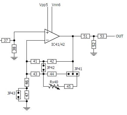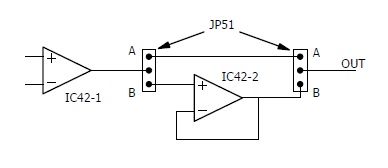 IC42(双回路オペアンプ)の休止回路を出力バッファーとして活用する機能です。 IC42限定のオマケ機能で、JP51を「B」にセットして使います。 高利得設定でなおかつ低い出力インピーダンスが欲しい時に有効な方法かもしれません。 このときにはIC41(単回路オペアンプ)は使えませんので注意が必要です。 通常はJP51を「A」にセットして使います。