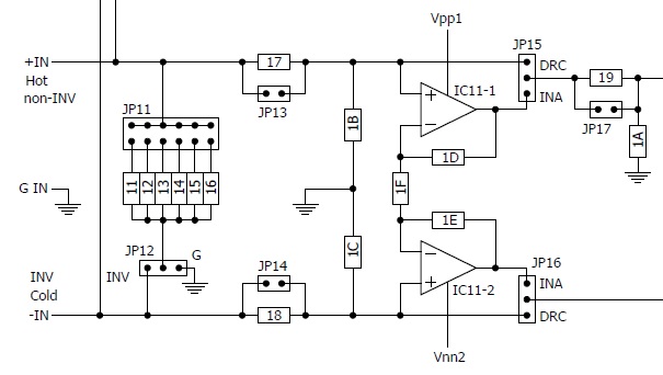 IC11はバランス入力用オペアンプです。双回路オペアンプを使います。 1D,1E,1Fはインスツルメンテーションアンプ(計装アンプ)を構成する抵抗です。 JP15,JP16で直接入力と計装アンプ入力を切り替えます。
