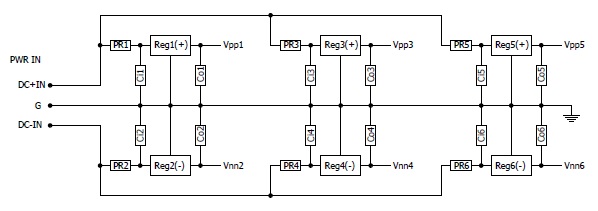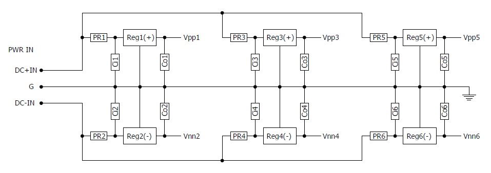 Ci1−6はレギュレーターの入力コンデンサー、Co1−6は出力コンデンサーです。