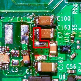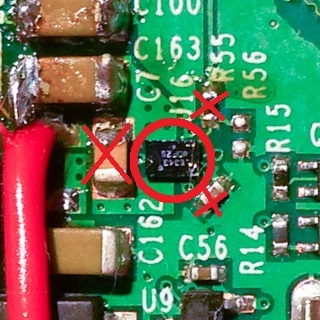 まず優先するのは以下の赤丸の部分、スイッチングインダクターの撤去です。
