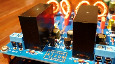 ※『Tripath(トライパス) TA2020-020 初段直結化 DCアンプ・スペシャル キット』の部品を実装し動作確認を行なったものになります。